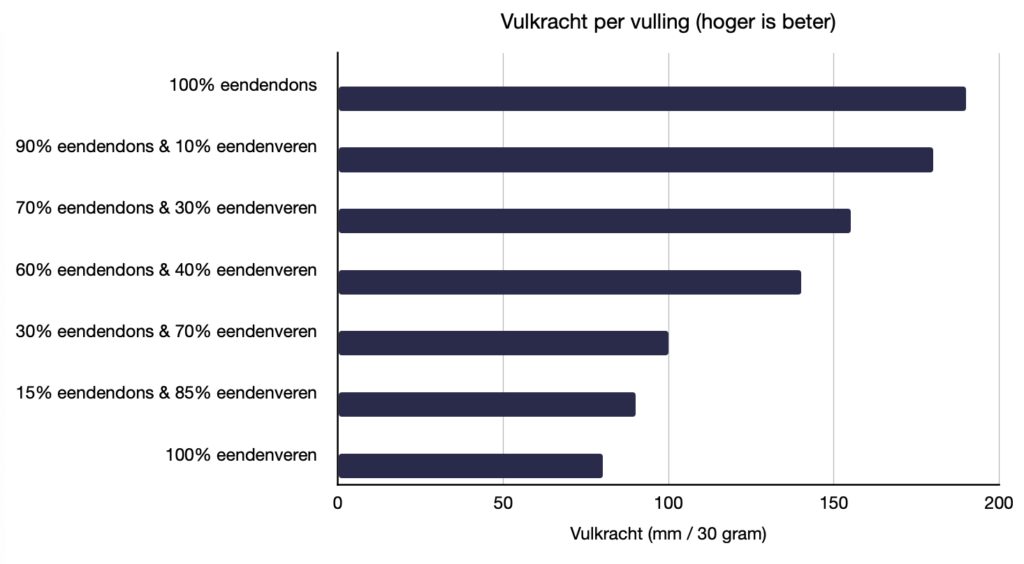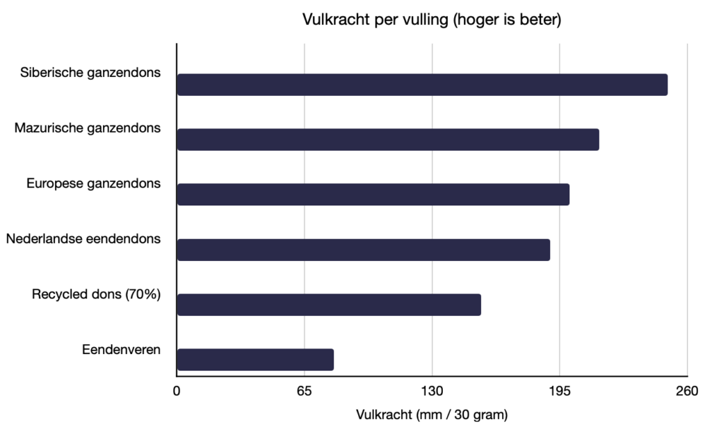 Quantities you may encounter are 150, 170, 200. Down with a high fill power is obtained from more mature ducks or geese and therefore more expensive. So fill power is a nice measure of quality. Unfortunately, there are also different methods of measurement, so this value can be higher or lower.